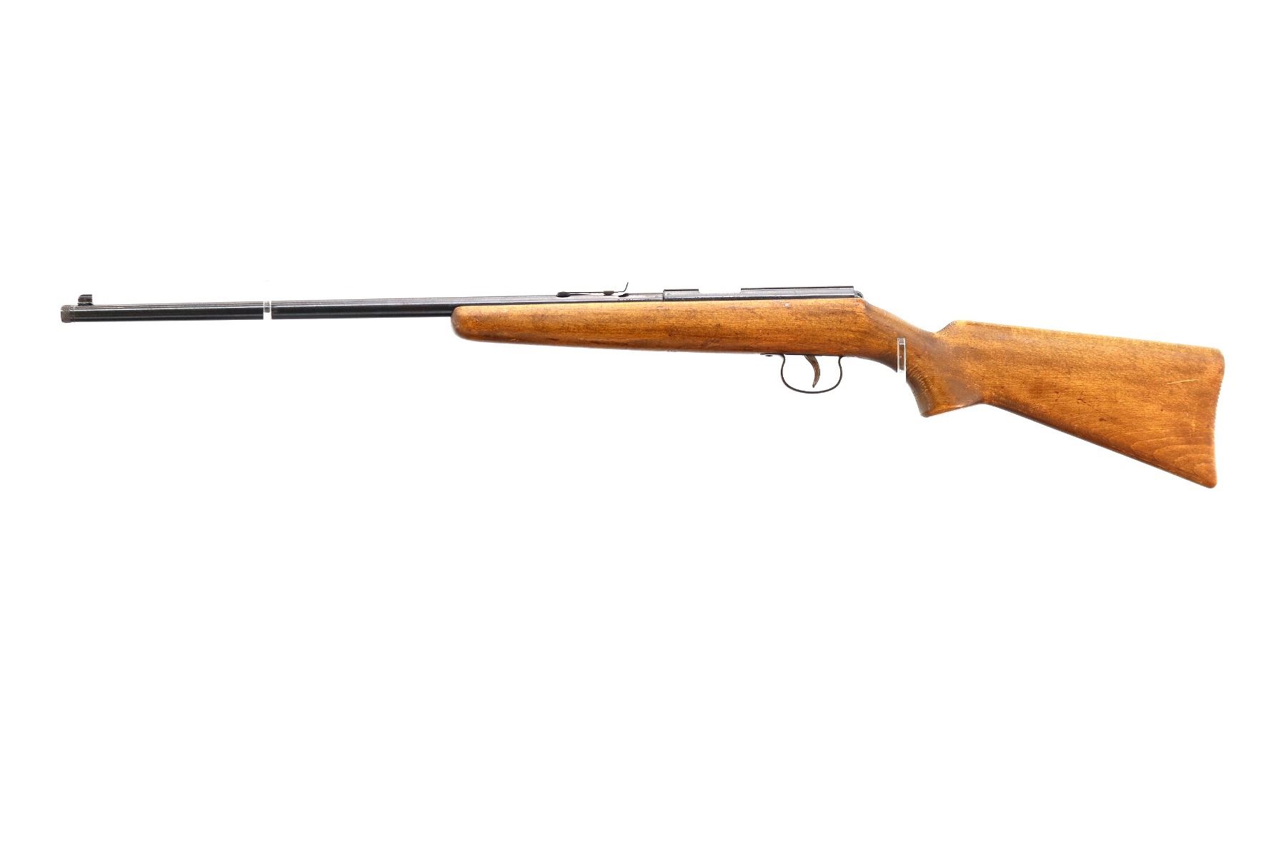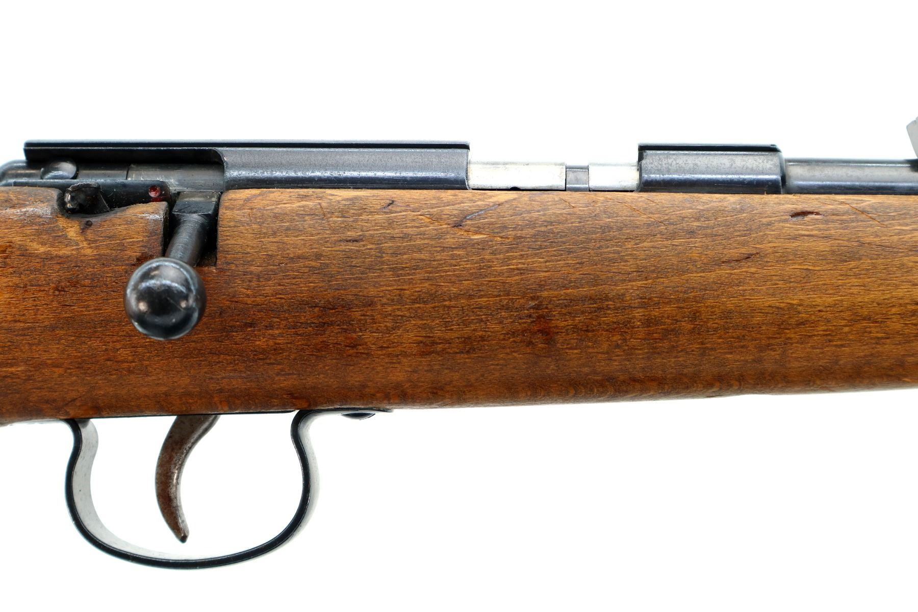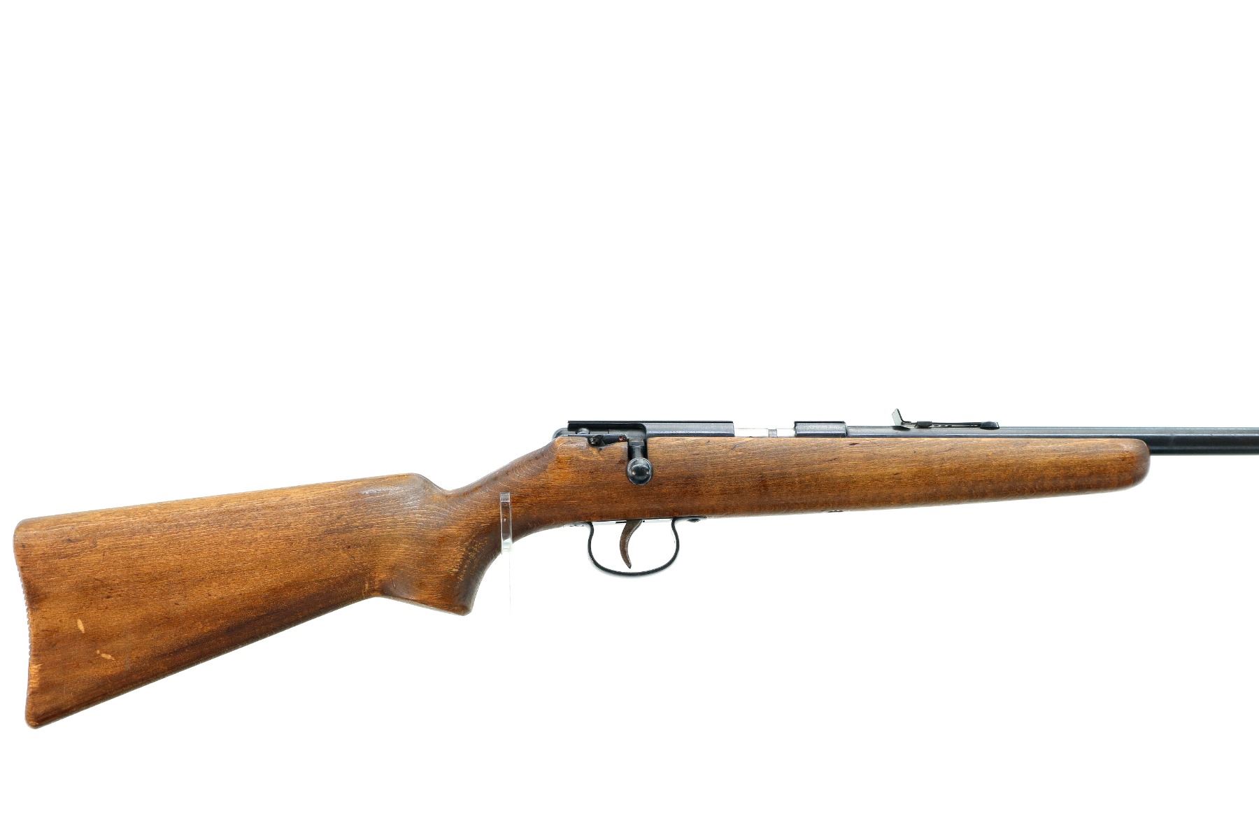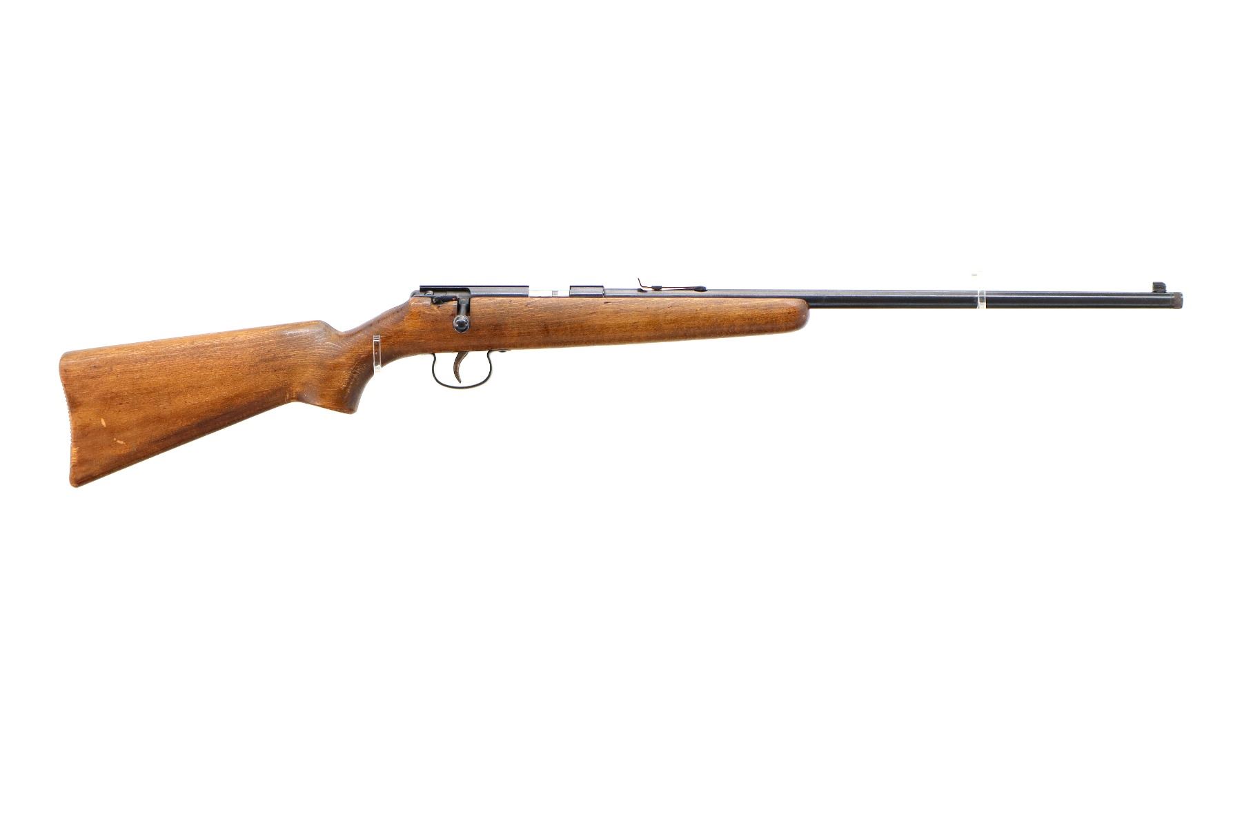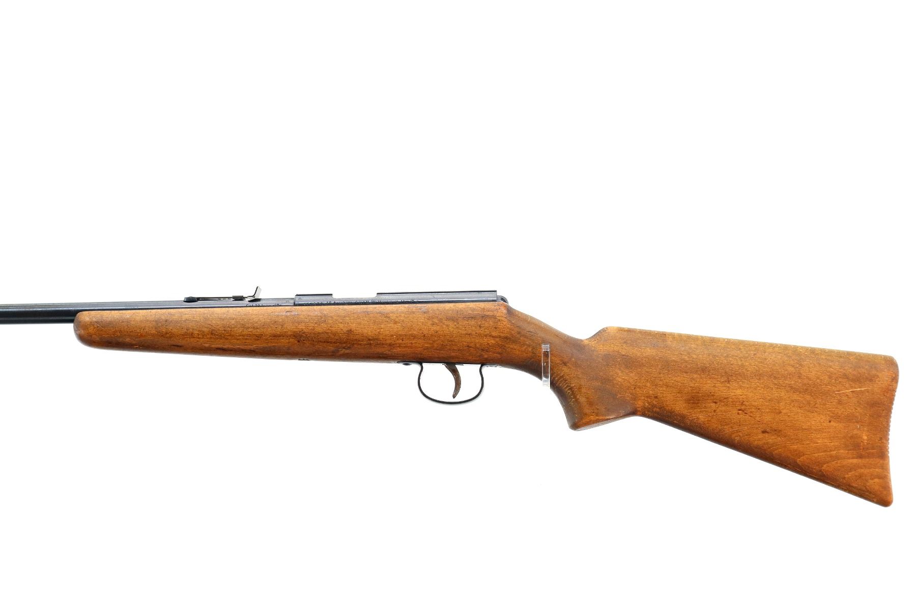 Main Description: Blade front sight, adjustable u notched rear sight, blued finish, grooved receiver. One piece wood stock, pistol grip, grooved butt small chips near toe.