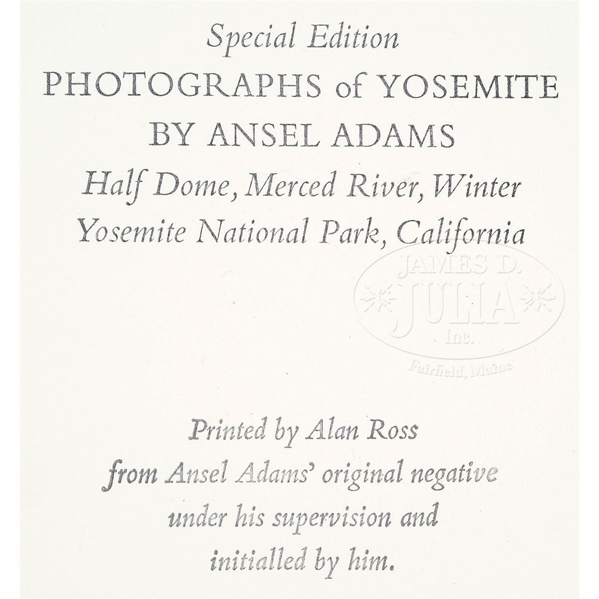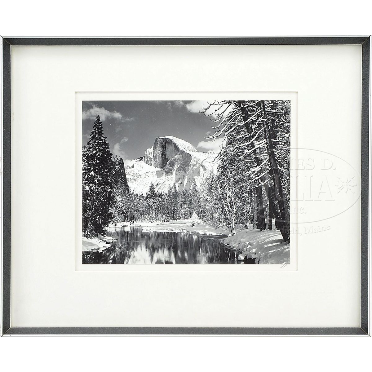 Photographic print, mounted on white backing Housed in a modern metal frame with black edge and white matte behind glass Initialed by Ansel Adams, lower right; on verso is stamped "Special Edition, Photographs of Yosemite by Ansel Adams, Half Dome, Merced River, Winter, Yosemite National Park, California" and "Printed by Alan Ross from Ansel Adams' original negative under his supervision and initialled by him." SIZE: Sight: 7-1/2" x 9-1/2". Overall: 13-3/4" x 16-3/4" PROVENANCE: From a Maine collection CONDITION: Very good to excellent 9-28575