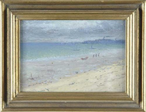 ANSON KENT CROSS (American, 1862-1944) FIGURES ON A BEACH. Oil on board beach scene shows three figures walking past small rowboat. A city is seen in background with green to blue ocean. Signed lower left and dated "14". Housed in a gilt molded wood frame. SIGHT SIZE: 6-1/2" x 9-1/2". CONDITION: Very good. 9-27821