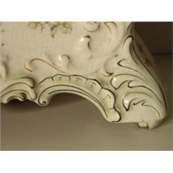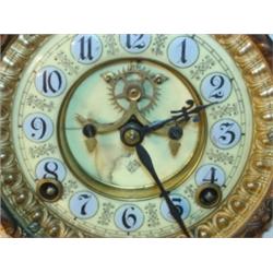 ANSONIA MANTEL CHINA CLOCK WITH FLORAL DECORATION. Decorated with purple and green flowers. Case is white. Crazing is visible on the front and back of case. Good overall cond. Does run, but time is not accurate. 11.5” H.