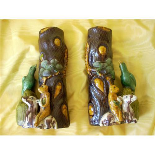BURTON BROOK FARM ANTIQUES presents a pair of Chinese Export early 19th Century moneky & deer vases modelled in mirror image. The vase being a tree trunk with a monkey seated on a deer at the trunk base and a bird perched on a large gourd observing the pair. The figures enamelled in predominantly famille vert and yellow with a brown tree trunk. / 10 1/2" TALL X 5"+ WIDE BASE / Mint Condition / This is a highly collectable pair of vases with the charming animals that only the Chinese can do.