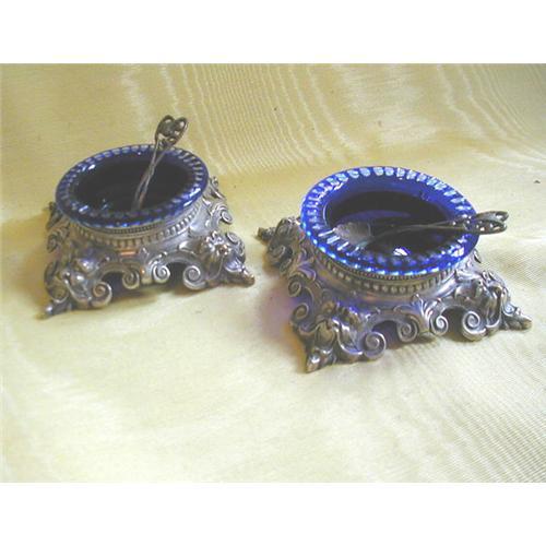 SUPERB ANTIQUE STERLING SILVER MASTER SALTS OF "GARGOYLE" FOOTED DESIGN AND BLUE GLASS FLUTED LINERS / STAMPED: STERLING WITH MAKER MARKS / These salts come with metal period spoons with a leaf form bowl<> BURTON BROOK FARM ANTIQUES