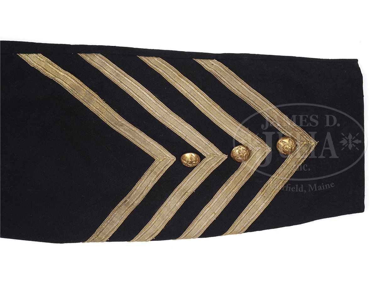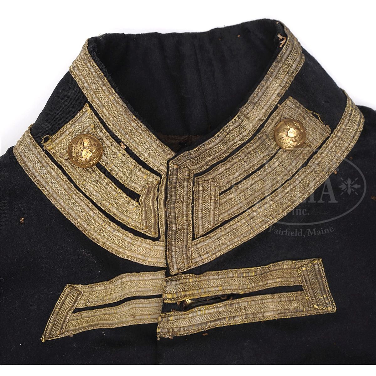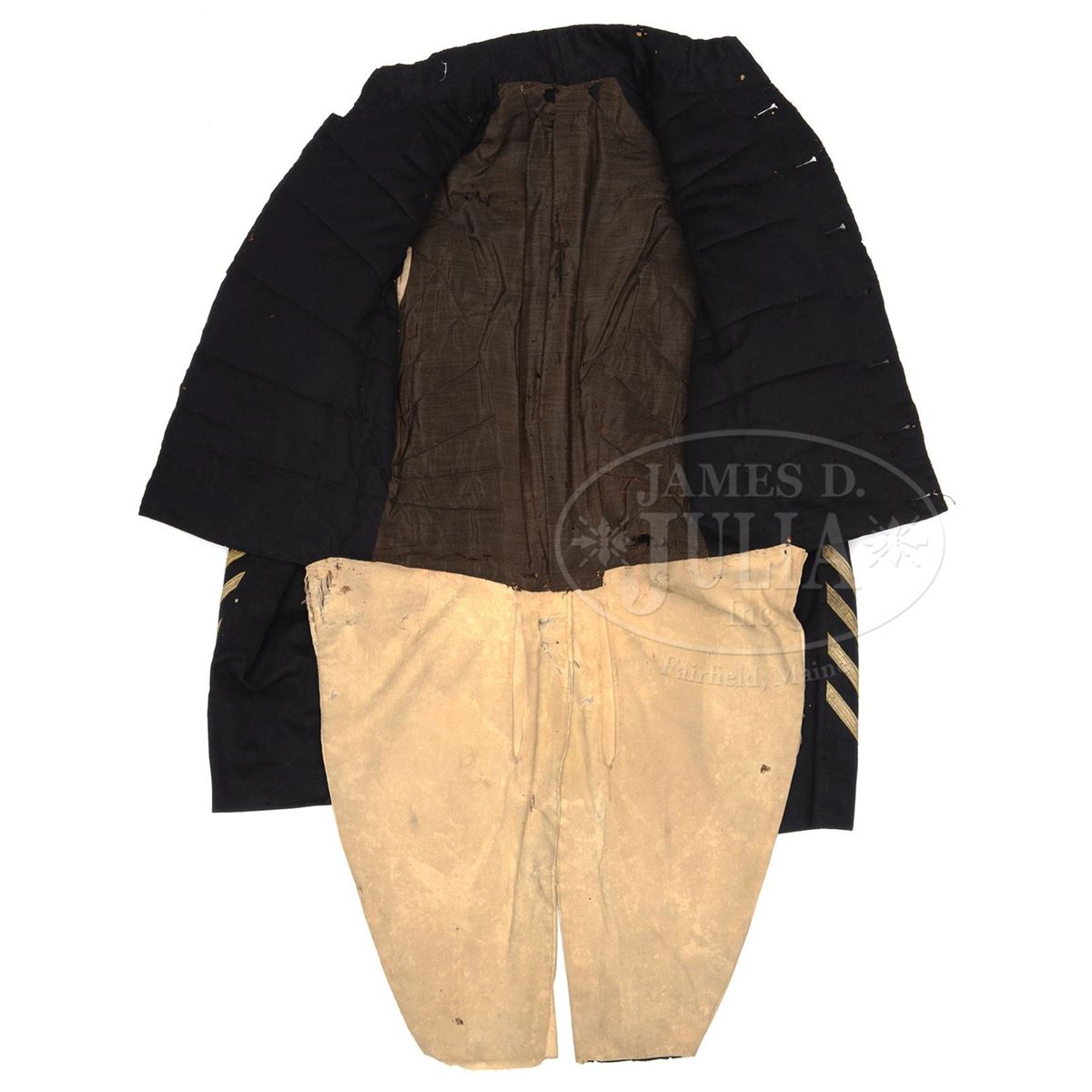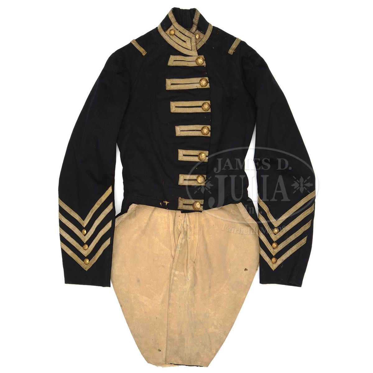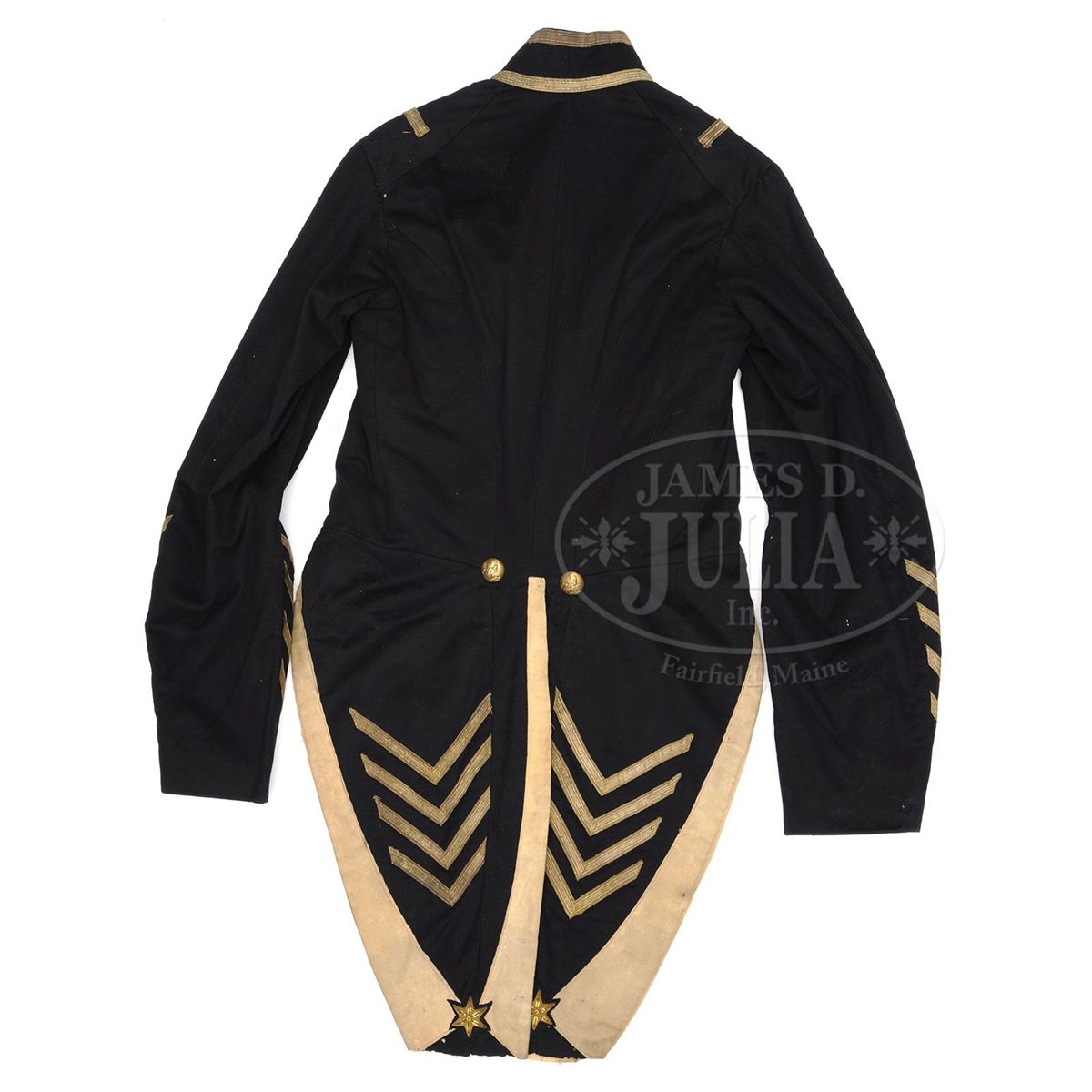 This militia tail coat which predates the Civil War is consigned along with Claudius Baker Denson's Confederate frock coat offered as the following lot. Though this coat does not have Denson's name as his frock coat does we known he was the founder of the Franklin Military Academy in North Carolina and this coat was typical of the prewar period. The buttons are regulation US eagle "I"s which denote infantry. The buttons are back marked "Horstmann & Allien" which are circa 1855-1860. The sleeves are quite bulbous like those seen during the Civil War measuring 8" in diameter with 5" cuffs. The coat has bullion tape decorations and a buff trim on tails. Coat has typical Civil War era construction with a padded breast, white cotton sleeve and pocket linings, and pockets in tails. There are 1-1/2" six pointed star decorations at the bottom of each tail. Regardless if this was Denson's coat or not, it descended in the same family and is most likely a southern used militia "tail coat". Denson's papers and wartime letters are found in an archive in the North Carolina Room of the New Hanover County Public Library in Wilmington, North Carolina. These documents are available online at the library's website. CONDITION: Coat is very good overall with dark navy blue color with some moth damage. A few of the larger 1" holes have old sewn repairs. Coat retains seven large 23mm buttons on face, two 23mm buttons on tails, and smaller 16mm buttons are found three on each cuff and one on each collar tab, no buttons are missing. 1/2" gold bullion tape trim is complete with some areas of loose stitching. Linings have numerous small tears and separations but are mostly intact and sound. 4-48699 JS212
