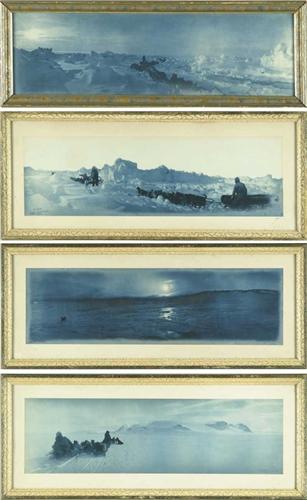 ANTHONY FIALA (Slovak American, 1869-1950) FOUR IMPORTANT PANORAMIC PHOTOGRAPHS OF THE ARCTIC. Framed blue and white images show different views of an Arctic expedition. 1) Line of sleds and sled dogs winding through snow and ice field. Signed lower left. Housed in a partial gilt molded wood frame. Appears to have water damage to bottom right. 2) Dark scene showing sled dog on ice field with bright sun low in the sky. Signed lower left. Also marked “Copyright 1906 A. Fiala”. Very good condition. 3) Two sled teams on snow field approaching snow covered rocks. Signed lower right and “Terra Nova”. Very good condition. 4) Three sled teams going through snow and ice field. Signed lower left “82? North”. Tear through corner of margin. The last three images are housed in identical decorated molded wood frames. Anthony Fiala was hired as photographer in the Baldwin-Ziegler expedition of 1901-02 then appointed leader of Ziegler’s next expedition in 1903-05. Neither expedition made it to the Pole but Fiala was credited with being the first to take moving pictures of the Arctic region. IMAGES SIZE: 10” x 33-3/4”. CONDITION: As noted above. One has no margins, the others are framed showing approximately 2” margin. 9-26988