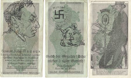 Lot of four obsolete 1,000 reichsmark Series 1922 banknotes overprinted on the verso with anti-Semitic messages meant to blame Jews for Germany's poor financial condition. Texts are all different, reading in part: "The gold, the silver and the bacon the Jew took from us and left us this shit. How long do you want to be betrayed and plundered by the Gold International? Come to Hitler and join the National Socialists...God the righteous! A new one has come again! [Hitler]... Soviet Jew Radek Train and workers' robber...Do you want him for your fuhrer?...Become National Socialists...You can recognize the prophets from their beards...". Caricatures show a Jew taken aback by a shining swastika, a British Jew making a radio address, etc. Very good.