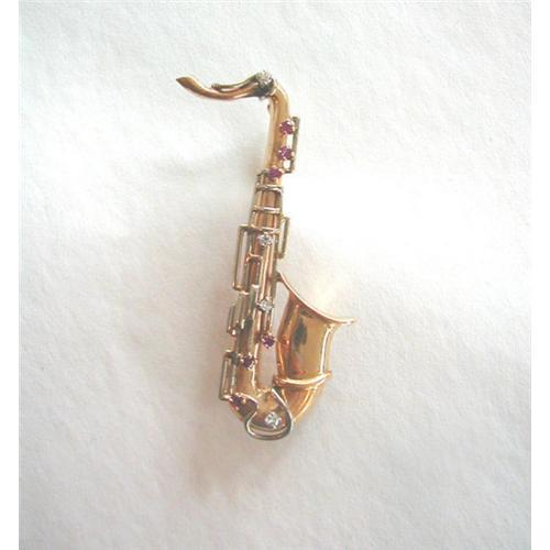 <tr><td>Title:ANTIQUE 14K / RUBY/ DIAMOND "SAXOPHONE" PIN</td></tr>