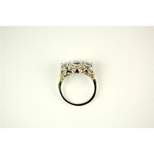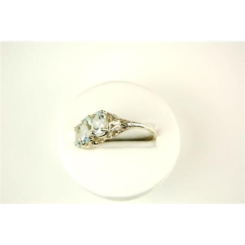 This Antique Style ring is an Authentic and Accurate copy of a ring CIRCA 1925 and THIS one is in MINT condition! It is a 14k White Gold FILIGREE Ring featuring a 3 Oval GENUINE AQUAMARINES = 2.50 CARATS! The AQUAMARINES are surrounded by very Beautiful Filigree work. This ring is a Size 7 1/2 and it can be resized either larger or smaller.