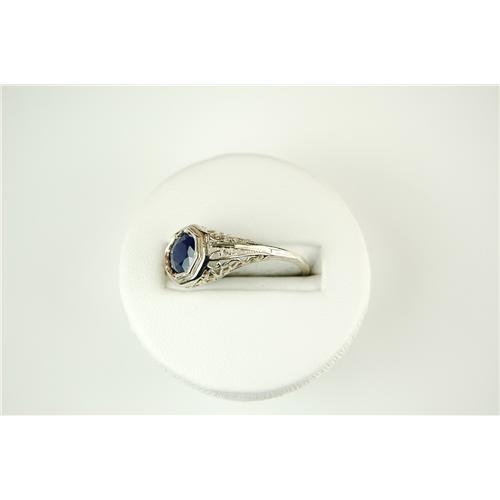 This ANTIQUE Style ring is an AUTHENTIC and ACCURATE copy of a ring from the 1930s but THIS one is in MINT condition! It is 14k WHITE Gold and it features a Genuine BLUE SAPPHIRE = .65 CARATS! The Sapphire is surrounded by exquisite FILIGREE work. This ring is a Size 5 1/2 and it can be resized either larger or smaller.