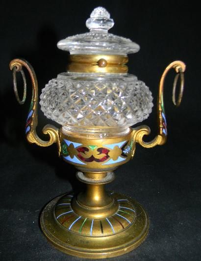 GT0611120003 ANTIQUE 1880s CHAMPLEVE ENAMEL ORMOLU CUT GLASS INKWELL. AN UNUSUAL ANTIQUE, CIRCA 1880s, PEDESTALED AND LEAF SCROLL HANDLED INKWELL STAND. THE ORMOLU BRASS IS WITH CHAMPLEVE ENAMELS ON THE BASS FOOT, THE COLLAR FOR THE INKWELL HOLDER, AND THE HANDLES. THE INKWELL WITH MOUNTED LID IS OF DIAMOND POINT PATTERN CUT GLASS. UNMARKED, PROBABLY FRENCH MADE. IT MEASURES 6in TALL BY 4in WIDE AT HANDLES. THE INKWELL ALONE MEASURES 3-7/8in TALL BY 3in DIAMETER. EXCELLENT CONDITION: BRASS WITHOUT DENTS OR BREAKS, ORIGINAL ORMOLU FINISH WITH SLIGHT PATINA.