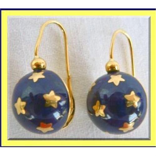 Gold loops with a little gold bead support the round half globes which are decorated with a cobalt blue enamel ground and golden stars scattered all over the surface. Highly attractive. <P><P>