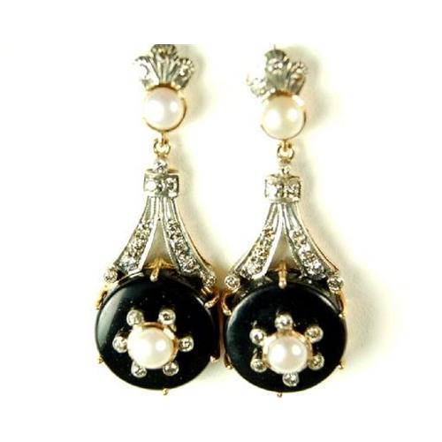 This ANTIQUE set features 18K GOLD EARRINGS with matching PENDANT. This magnificent Antique 18K Gold Pendant features a round BLACK ONYX with enter PEARL encircled by DIAMONDS. There are Diamonds above and below the Black Onyx, and the DIAMOND Total Weight = ONE CARAT! The Pendant measures 2 1/2 inches in length and it is 1 inch across and it IS in MINT condition! The matching 18K Gold Earrings also feature BLACK ONYX, DIAMONDS and PEARLS. The Earrings are 1 3/4 inch in length and they are 1/2 inch across at the base, and they too are in Mint condition. The Earrings have Gold post style backs for pierced ears. (CLICK ON PHOTO2 TO SEE EARRINGS)