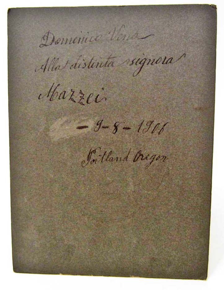 Written on back: "Domenico Vena. Alla Distinta Signora Mazzei (The Distinguished Lady Mazzei). 9-8-1906. Portland, Oregon". 6" x 8"
