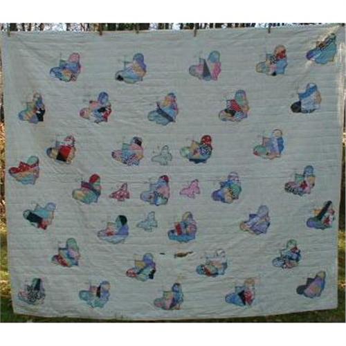 This c.1920's antique quilt has 37 Butterflies appliqued to a off-white muslin. The reverse is solid off-white muslin..... it is heavily padded and the front and back are stitched together with parallel rows of stitching that are about 2" apart. The quilt is 72" x 85" and the Butterflies are 9" and 6" across. There is an 8" and a 2" tear through 1 section between the parallel stitching and some soil, it is otherwise in very good condition.