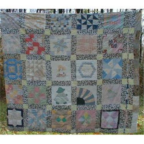 This is a great, very ambitious antique patchwork quilt that is heavily padded and could probably be termed a "featherbed"(early name for heavy comforter type quilts). It is 70" x 80" and features 25 squares on the front side, each of different quilting patterns and 2 squares in the center with female figures. One is of a Sunbonnet Baby and the other is a hand embroidered Flapper type woman with a bonnet. The reverse side also is made up of quilted squares and as stated earlier, it is heavily padded and hand tied. It is entirely hand-stitched except the Flapper woman who has some machine stitching. Two 2 1/2" squares of pink silk on the front side have suffered some "melting", and there is some minor soiling, otherwise it is in very good condition.