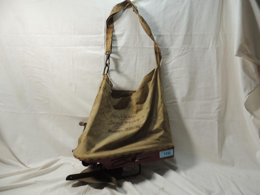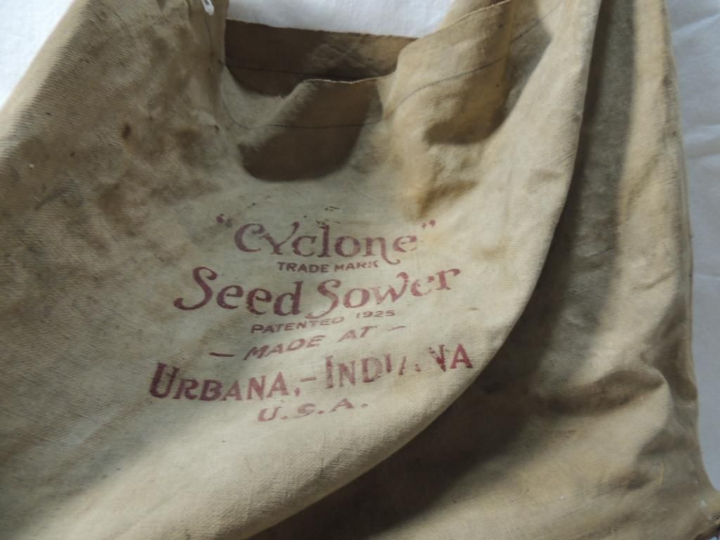 ANTIQUE OLD VINTAGE CYCLONE SEED SOWER FOR PLANTING SEEDS WOOD AND CANCAS ANTIQUE VINTAGE FARM EQUIPMENT OUTDOOR YARD EQUIPMENT PRIMITIVE. WOOD HAND TOOL CRANK VINTAGE CYCLONE SEEDER HAND HELD CRANK SEED SPREADER/SOWER/PLANTER AS SHOWN. SEE PHOTO FOR MORE