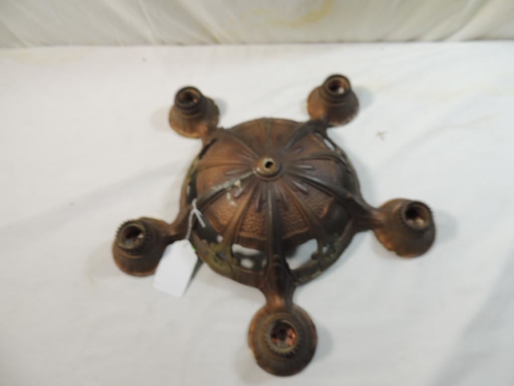 ANTIQUE METAL LIGHT FIXTURE 5 LIGHT CEILING LIGHT FIXTURE. DECORATIVE AS SHOWN SEE PHOTO FOR MORE DETAILS.