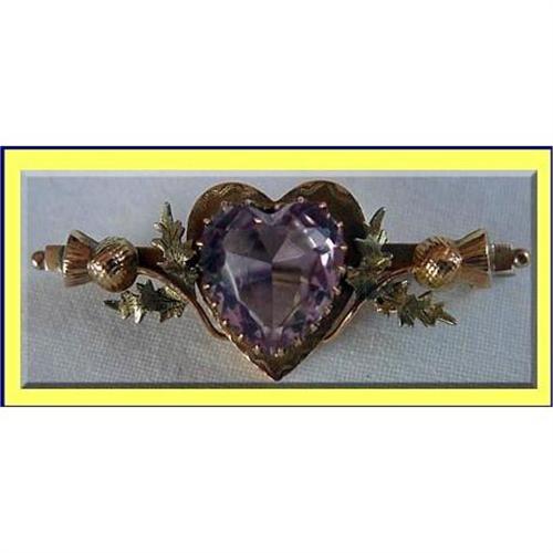Large heart shaped, faceted amethyst on a gold heart-shaped plate, engraved with delicate highlights. Surrounded by two arms with twining thistle flowers and foliage. THistles, symbolic of Scotland, were very popular during Queen Victoria's reign. Back has pin with C-Catch and is engraved with maker's initials and the symbols for 9 carat gold (9 and 375).