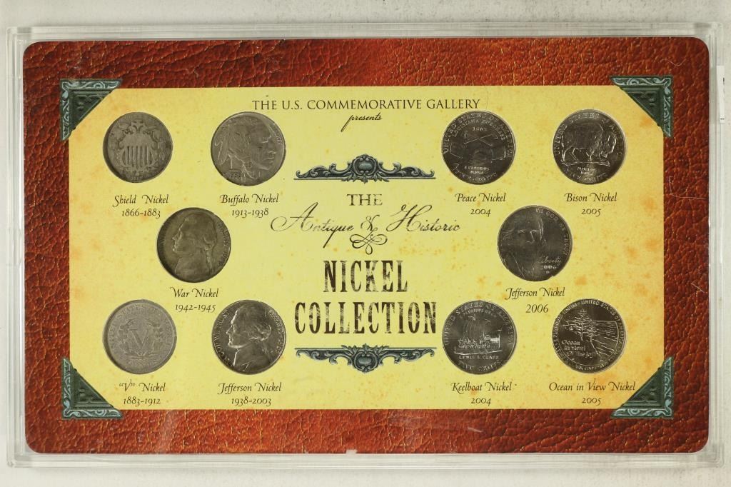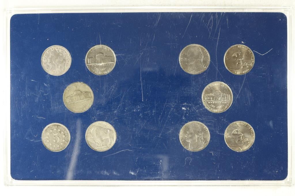CONTAINS: 1867 SHIELD NICKEL, 1892 LIBERTY "V" NICKEL, 1936 BUFFALO NICKEL, 1945-S 35% SILVER JEFFERSON WAR NICKEL AND 6 OTHER JEFFERSON NICKELS IN PLASTIC CASE
