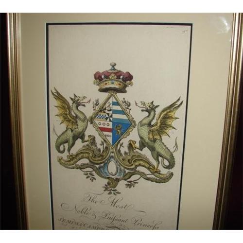 Circa 1800 Antique Fantastic Crest Coat of Arms of Jemima Campbell. This antique old Armorial coat of arms is framed and matted in a new gold frame. Very tastefully done. The frame measures 15 3/4" X 23". The Crest is Bright and clear and very incrately done. You don't see old family crests like this in this kind of great condition. LUCAS OF CRUDWELL. THE MOST NOBLE OF LUISANT PRINCE. Wonderful Artwork. Je3mima Campbell/Marchioness Grey was born October 9, 1723. Gained the title of Baroness Lucas. Jemima Campbell married Phillip Yorke 2ND Earl of Hardwicke. This goes on and on--Just google it and you will know everything. Additional images are available upon request.