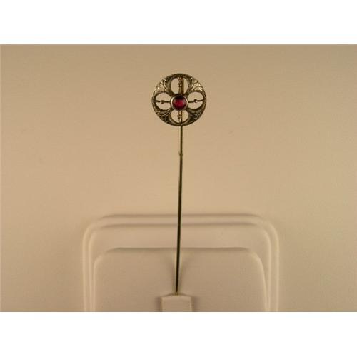 THIS ANTIQUE ART DECO GOLD STICKPIN IS CIRCA 1915 AND IT IS IN EXCELLENT CONDITION. It is 10K White Gold and it features a GENUINE BRIGHT RED RUBY in the center. The Ruby is surrounded by openwork and exquisite engraving. The head of the Stickpin measures 1/2" across.