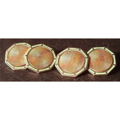 A FINE PAIR OF OF THREE COLOR GOLD FILLED AND GULLOCHE ENAMLED CUFFLINKS. MARKED O.