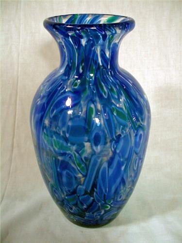 ANTIQUE ART GLASS VASE WITH VARIOUS SHADES OF BLUE PATTERNED THROUGHOUT. 10.5" X 5"