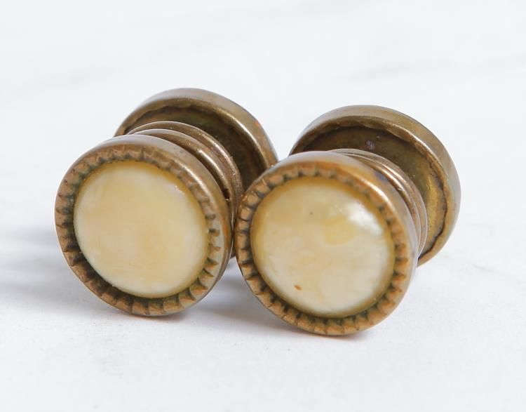 ANTIQUE ART NOUVEAU BRONZE & MOTHER OF PEARL CUFFLINKS19th century Art Nouveau cufflinks made of bronze and mother-of-pearl. Size: ½" length, ½" diameter. Scarce and highly collectable item.