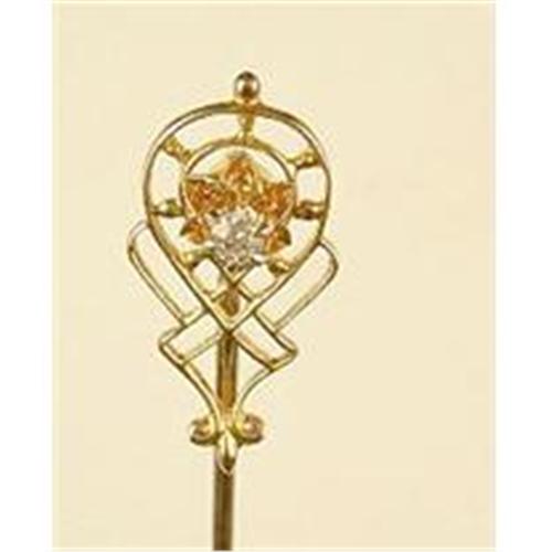 THIS ANTIQUE ART NOUVEAU GOLD STICKPIN IS CIRCA 1900 AND IT IS IN EXCELLENT CONDITION! The Stickpin is 10K Yellow Gold and it features a wonderful Gold Frame with openwork surrounding a SPARKLING DIAMOND = .02 CTS. This Antique Gold Stickpin has a MAKERS MARK for FEINSTEIN & COMPANY of New York City.