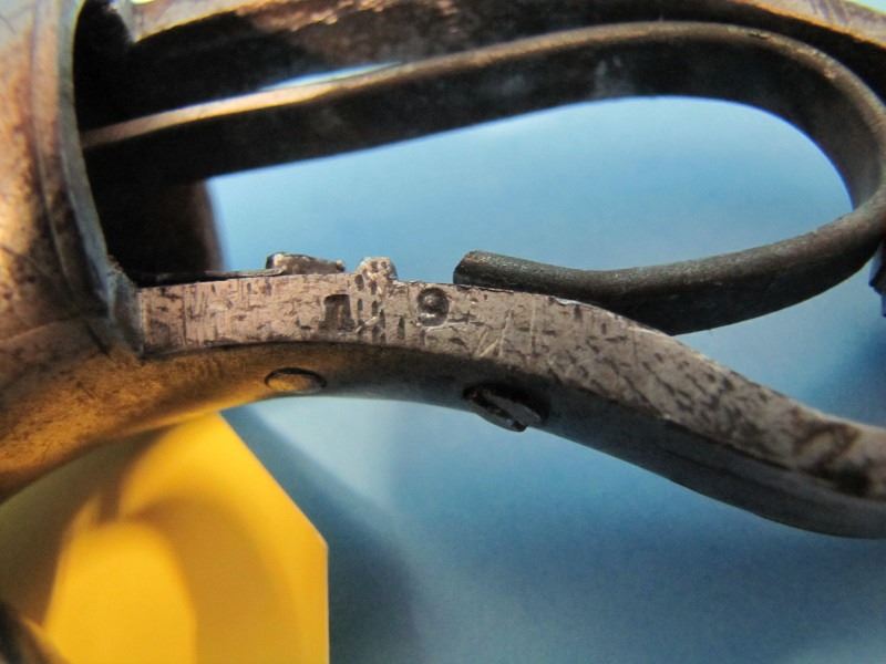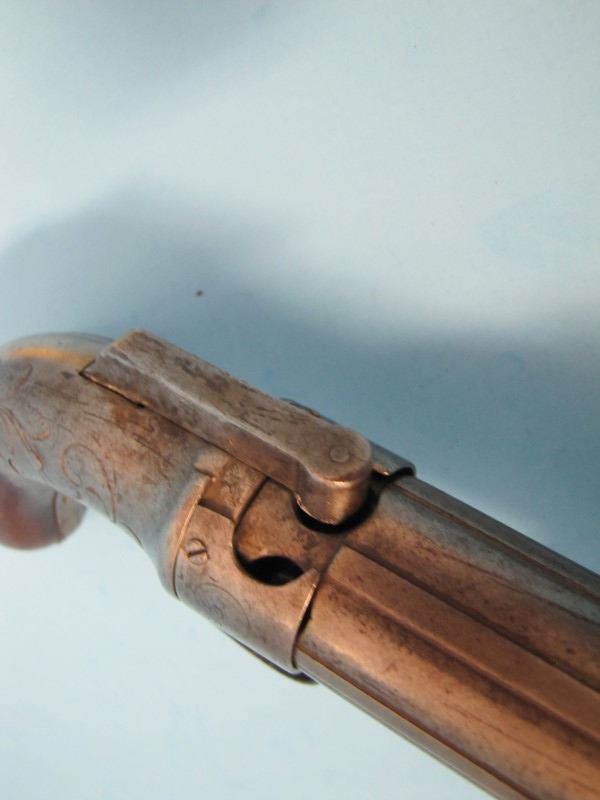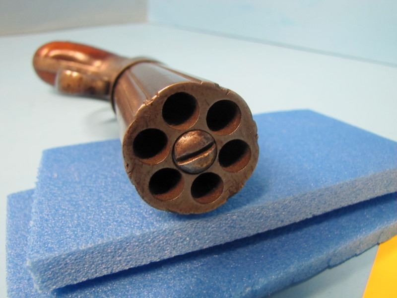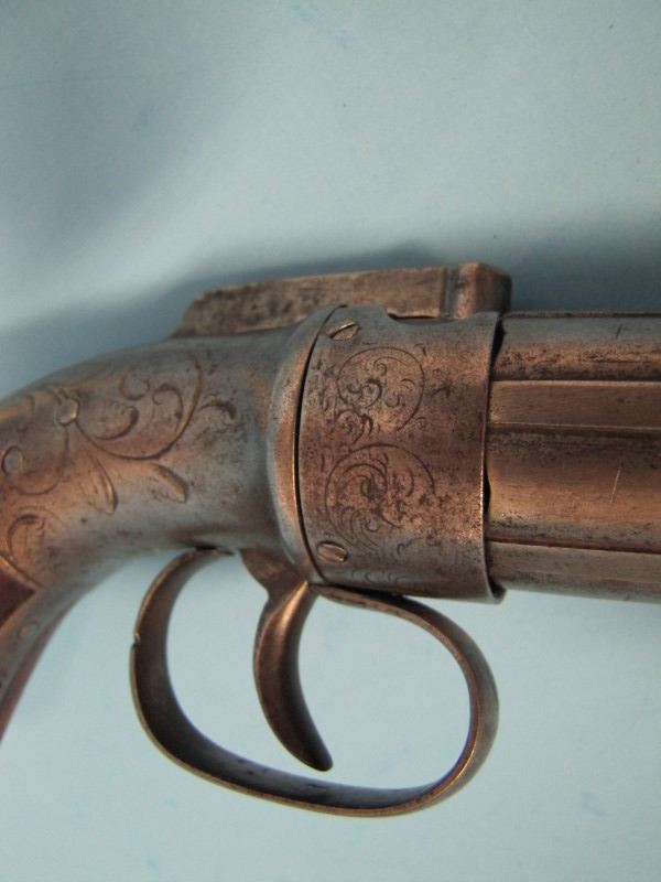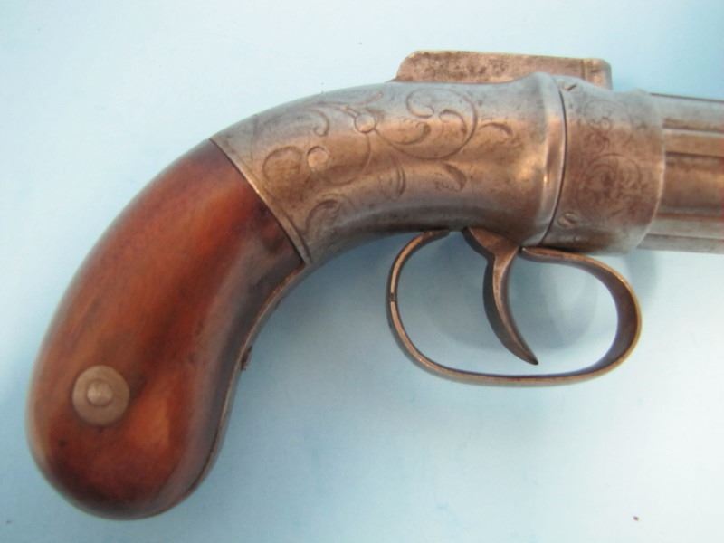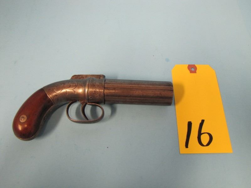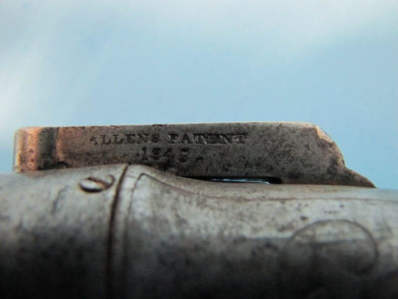 Allen & Thurber Pepperbox (Ethan Allen), 6 shot, approx .31 caliber, Stamped Allens Patent 1845 on the Hammer, Type 3 Manufactured from 1847 -1865 in Worchester Massachusetts, Barrel length 3 7/8 inches. Hammer functions, barrel does not rotate properly. serial #19 stamped on inside of trigger guard and on steel under grips