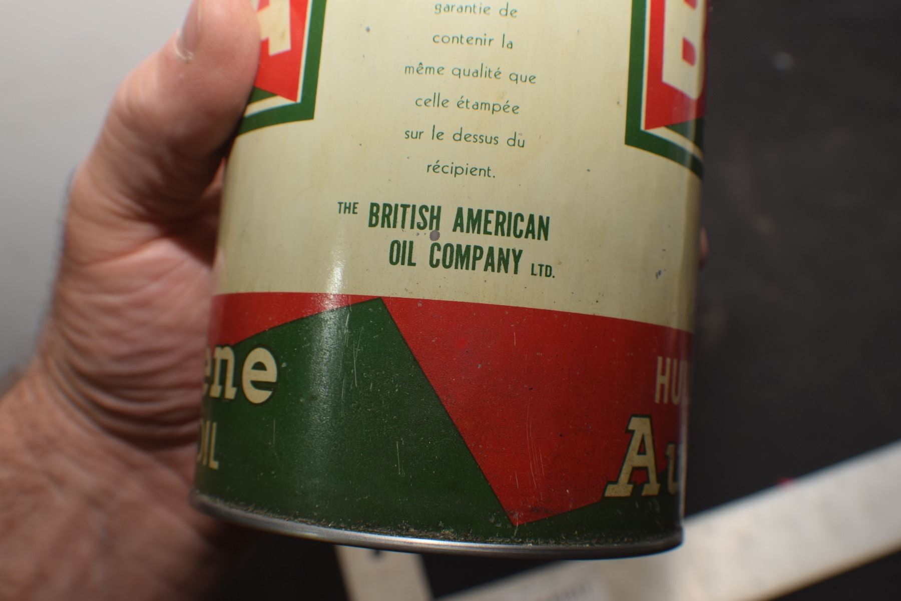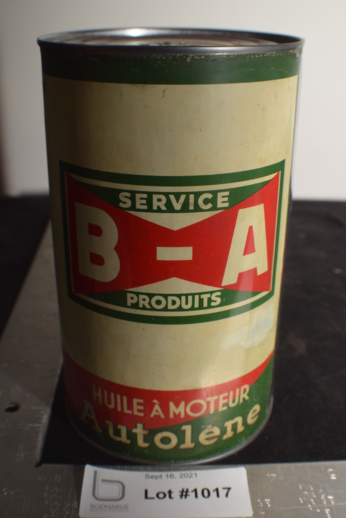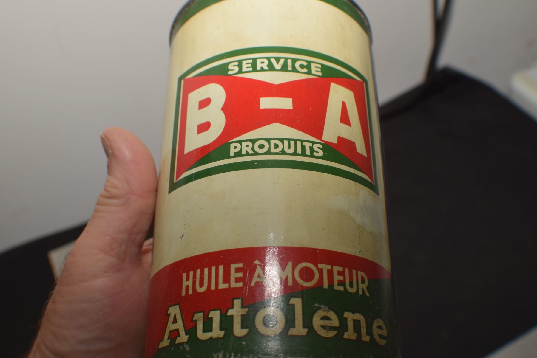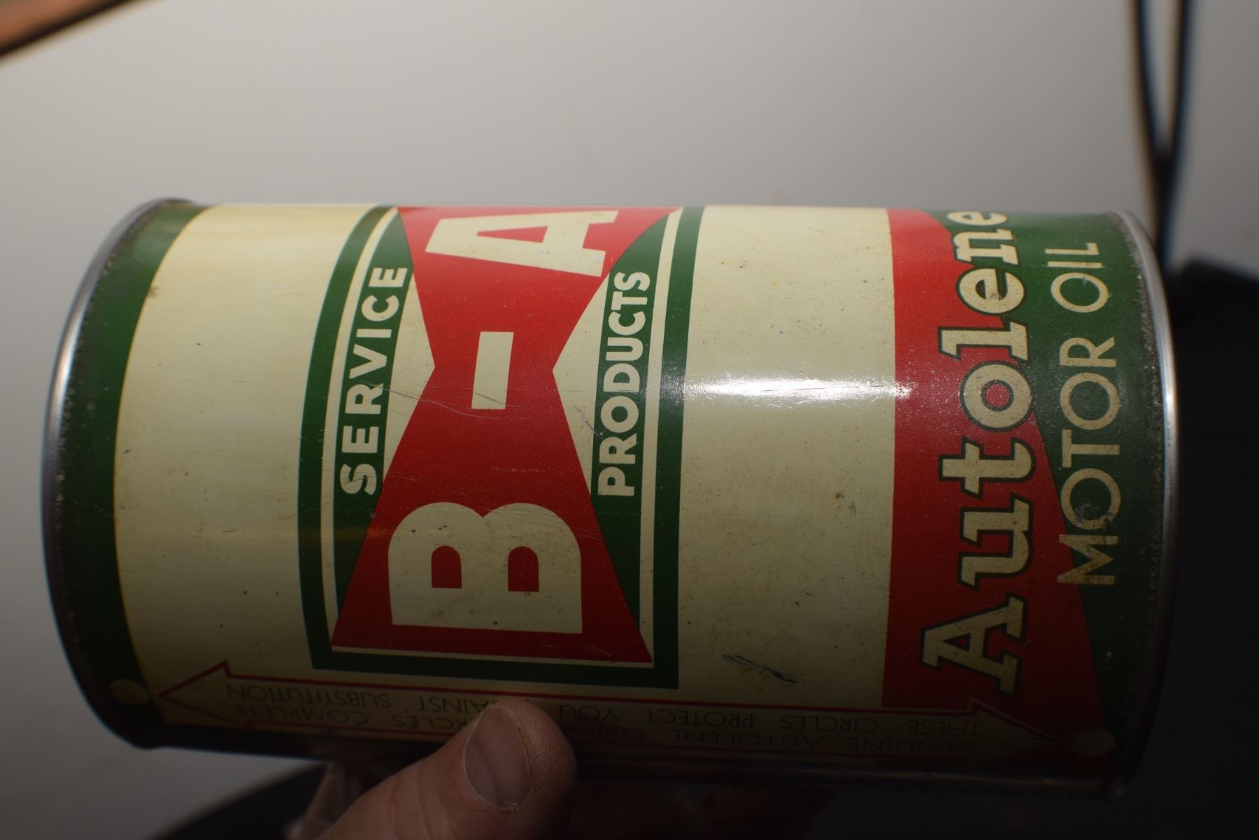 ANTIQUE B/A BRITISH AMERICAN BOWTIE QUART OIL TIN , THIS IS A RE-ROLL NOT A NEWER WRAP