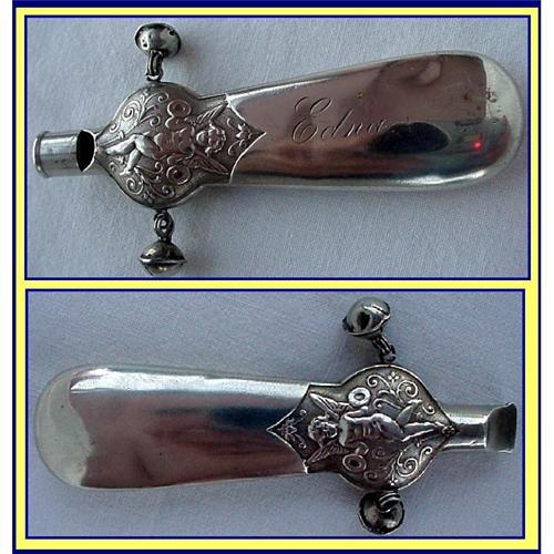 Victorian silver babie's rattle and whistle with repousse winged putti / cherubs on either side. 19th century, English.<BR>Measures a little over 3 1/2inches long.<BR>Front is engraved with baby name EDNA. On either side is a bell and one end narrows to form a whistle (very loud when used). Both front and back have a wonderful repousse winged <BR><BR>cherub clashing cymbols, surrounded by delicate scrolling foliage. Great quality.<BR>since there are no hallmarks, we assume this to be silver plate.<BR>Condition generally very good. There is a negligible ding on both sides (did baby take a bite?).