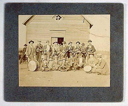 ANTIQUE BAND WITH INSTRUMENTS MOUNTED PHOTO - Band Members appear to be Sitting in Front of a Country Church. Approx. 6" x 5"
