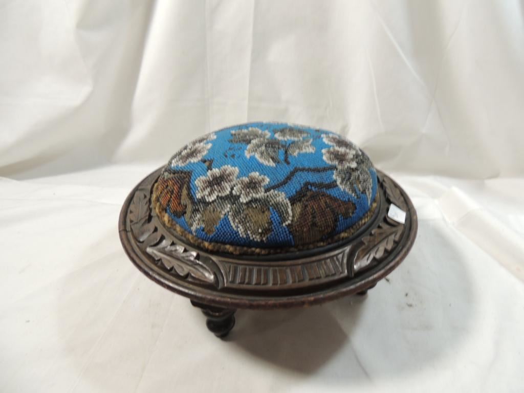 ANTIQUE BEADED CARVED WOOD FOOTED STOOL PIN CUSHION. AS SHOWN. SEE PHOTO FOR MORE DETAILS.