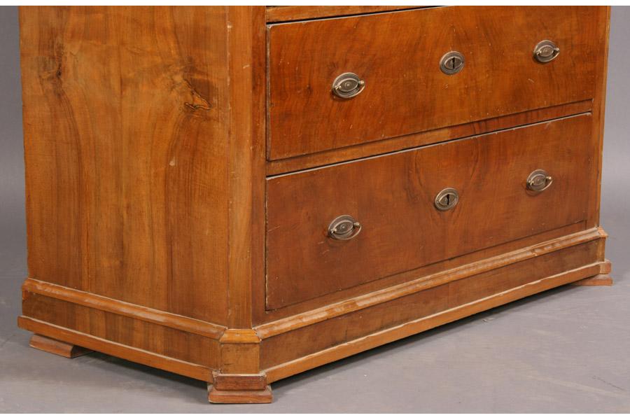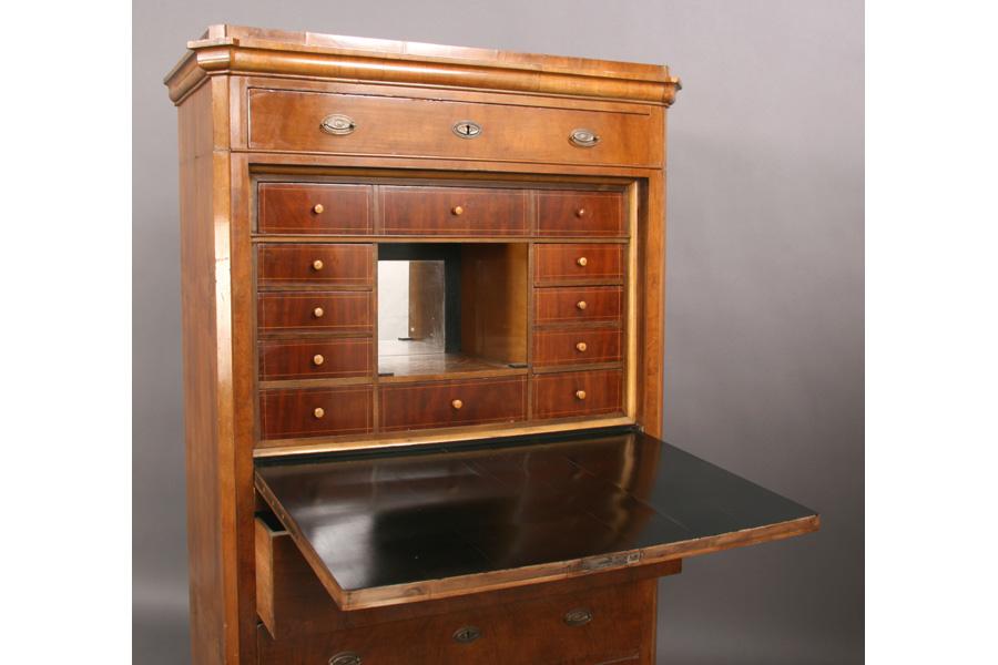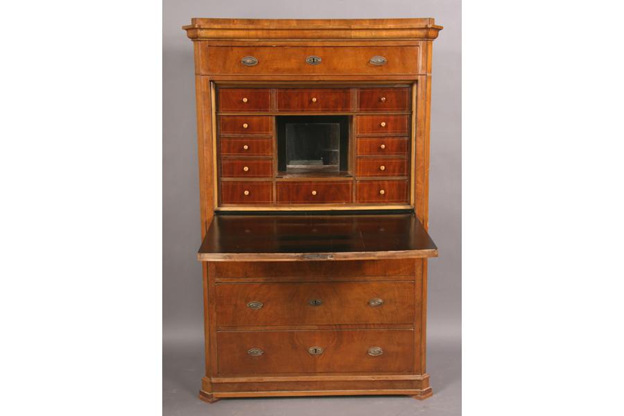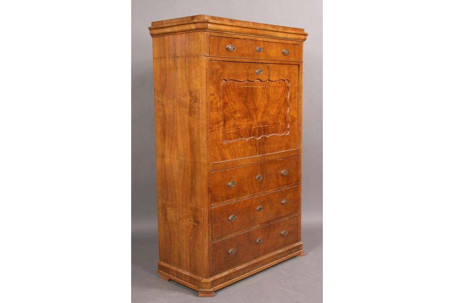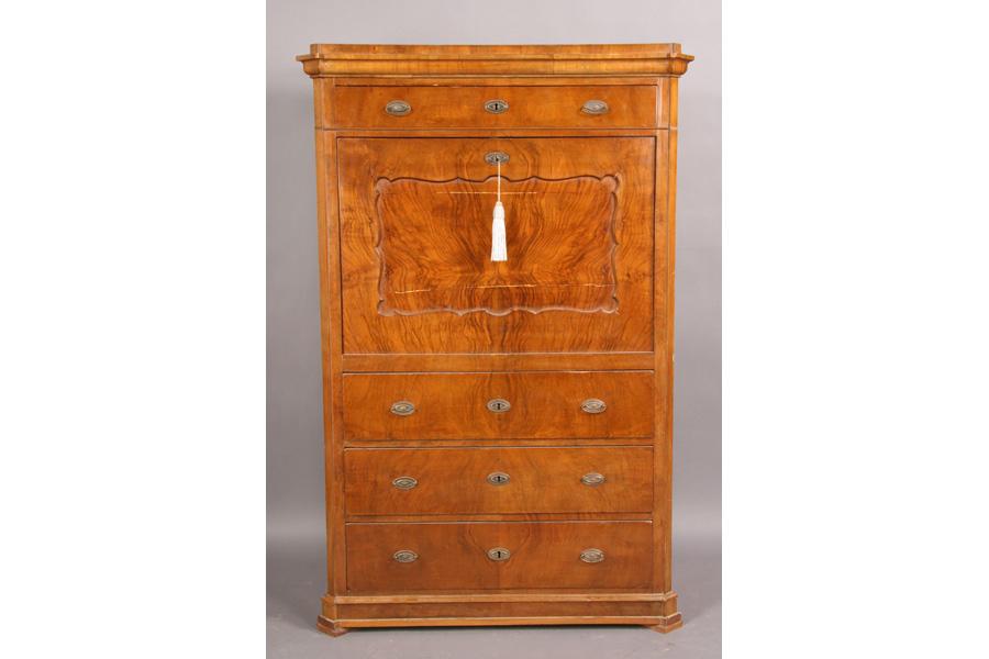 Antique Biedermeier abattant with fitted interior desk, molded crown, four drawers and a stepped base circa 1850. Ht: 66" Width: 43.5" Depth: 20.5" ***PLEASE NOTE: All property shall be paid for by the purchaser within five (5) business days of the sale. Kamelot Auctions accepts cash (In house only), personal checks, certified checks and money orders. We do not accept credit cards or Paypal under any circumstances. Please note our policy regarding payments from International buyers: The only acceptable method of payment is a bank wire/bank transfer. For invoices more than $1000, there is no additional fee for this service. For invoices less than $1000, please include an additional $25 wire fee. We will be happy to forward our bank wiring information after the completion of the auction. Thank you for your understanding and cooperation. All purchases must be removed within 15 business days after an auction. Property not removed from our facility after 15 business days will be moved to an off-site storage facility at a charge of $10.00 per day payable by the buyer. Kamelot does NOT provide shipping services or estimates. However, we recommend the following independent shipping services: Antique Transport Co. at antiquetransport@cs.com, Farren Transport at farrentransport@comcast.net or All Points Shipping at jb@allpointsshippingnj.com for quotations and shipping arrangements for furniture and other large items that would require a blanket wrap shipping company. For quotations and shipping arrangements for smaller items that would traditionally be shipped through UPS, please contact The UPS Store at store4744@theupsstore.com or The Packaging Store at hrpa112@aol.com. Clients are welcome to pick up their items from our location or make their own shipping arrangements.