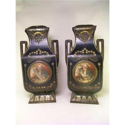 <table width="100%" border="0" cellspacing="0" cellpadding="4"><tr><td><em> RARE,RARE A LARGE PAIR of ART NOUVEAU ENGLISH BISCUIT TINS</em></td></tr><tr> <td width="100%"> Beautiful and highly decorative biscuit tins were a marketing tool for biscuit makers during the turn of the twentieth century. After the biscuits were eaten the tin became a decorative accessory. This is a rare to find matching pair of double handled urn type tins. These are made by John Buchanan & Bros. Ltd England and each tin stands 11 inches high, being 6 inches wide. They are in good condition, wear and aging as expected for this age, but generally very nice and most decorative, they resemble Huntley and Palmers tins. A wonderful addition to your antique bisuit tins collection. </td></tr><tr> <td> </td></tr><tr> <td>Reference #: TVBT6281</td></tr><tr><td>Condition:Original </td></tr><tr><td>Year:1890-1910</td></tr><tr><td>Title:ANTIQUE BISCUIT TINS ART NOUVEAU LARGE URNS</td></tr><tr><td>Location:WA</td></tr></table>