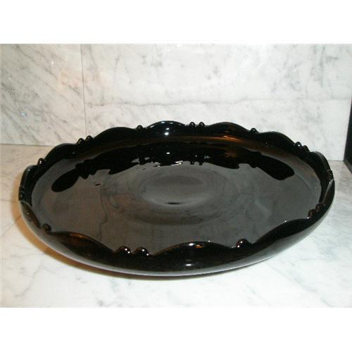 WE PRESENT TO YOU A BLACK AMETHYST GLASS SERVING TRAY SHOWING A DEEP PURPLE WHEN HELD UP TO THE LIGHT, A TRUE BLACK AMETHYST GLASS PIECE-RARE AND HARD TO FIND. USUALLY WITH BLACK AMETHYST THE COLOR VISIBLE WHEN HELD UP TO THE LIGHT IS  OF MANY DIFFERENT SHADES, NOT JUST THAT OF DEEP PURPLE, SHADES OF RED,GREY,BLUE,BROWN,AND OTHERS. MOST GLASS MAKERS ONLY WANTED A GOOD LOOKING BLACK IT DIDN'T MATTER WHAT IT LOOKED LIKE HELD UP TO THE LIGHT. THIS PIECE IS POSSIBLY FROM PADEN CITY GLASS CO