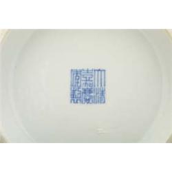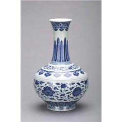 Very finely detailed, Chinese Chia Ch'ing mark and of the period, blue and white porcelain bottle vase of fine form, globular body, splayed foot and long neck with everted mouth, with scrolling lotus, cloud collar, squared scroll and waves and plantain leaf designs (repaired rim chip), late 18th Century; H: 14 1/2"