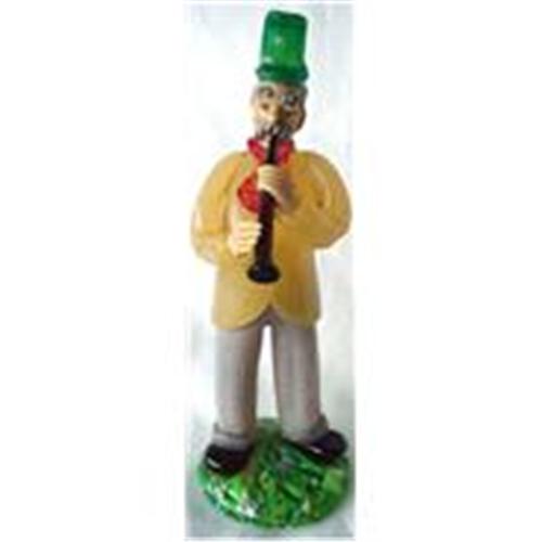 Highly reminiscent of the hardstone figures made by Faberge 100 years ago. Early 20th century hand blown glass figure of a musician / trumpetplayer. Bohemian / Chechoslovakian. <P><P> He is 8" tall and the diameter of the base is 2 3/4". <P> Fantastic OLD glass with marvellous play of light. All handblown, handmade by a top artist craftsman. The base is green, much like a millifiori paperweight. Black shoes, grey trousers, yellow shirt, red scarf, high green hat and wonderful, wonderful features. The trumpet / horn appears to have had some kind of professional restoration, not visible to the eye, but has a slight roughness, near the hands, which are however, perfect. Wonderful bushy moustache and eyebrows. The detail is quite marvellous and the quality of glass exceptional.