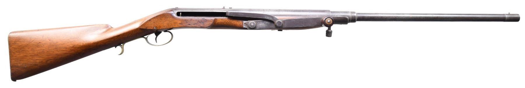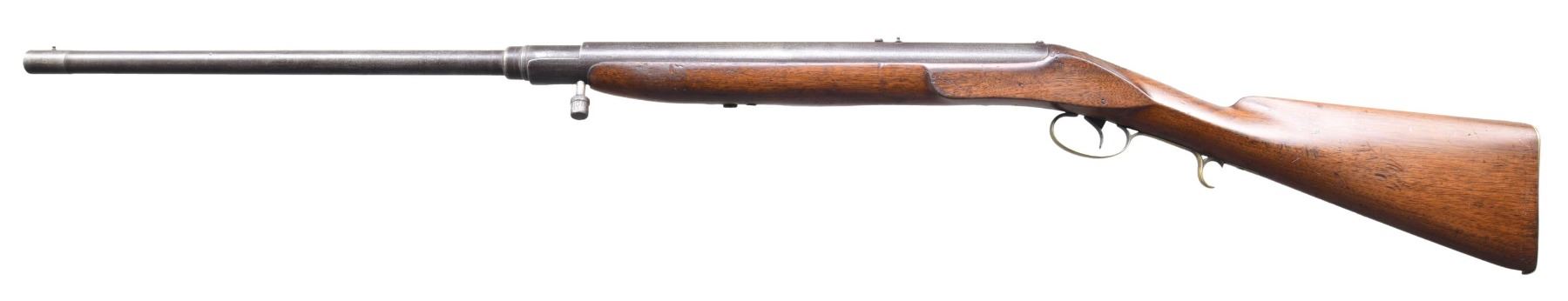 AIR GUN. Cal. .22. NSN. Mfg. 1860's in Boston, Mass. Stepped 18" barrel with bead front sight & bolt handle that locks into receiver. Side lever cocking spring action. Walnut stock with brass triggerguard & brass buttplate. CONDITION: Metal has gray patina appearance with pitting & marks. Sanded & refinished wood has small cracks & marks. Smoothbore w/ shiny appearance with light pitting. (02-23919-4/MD). $400-600.