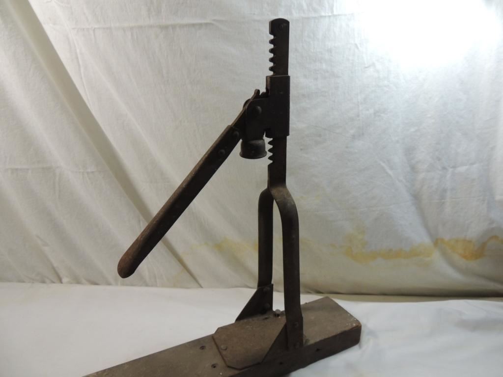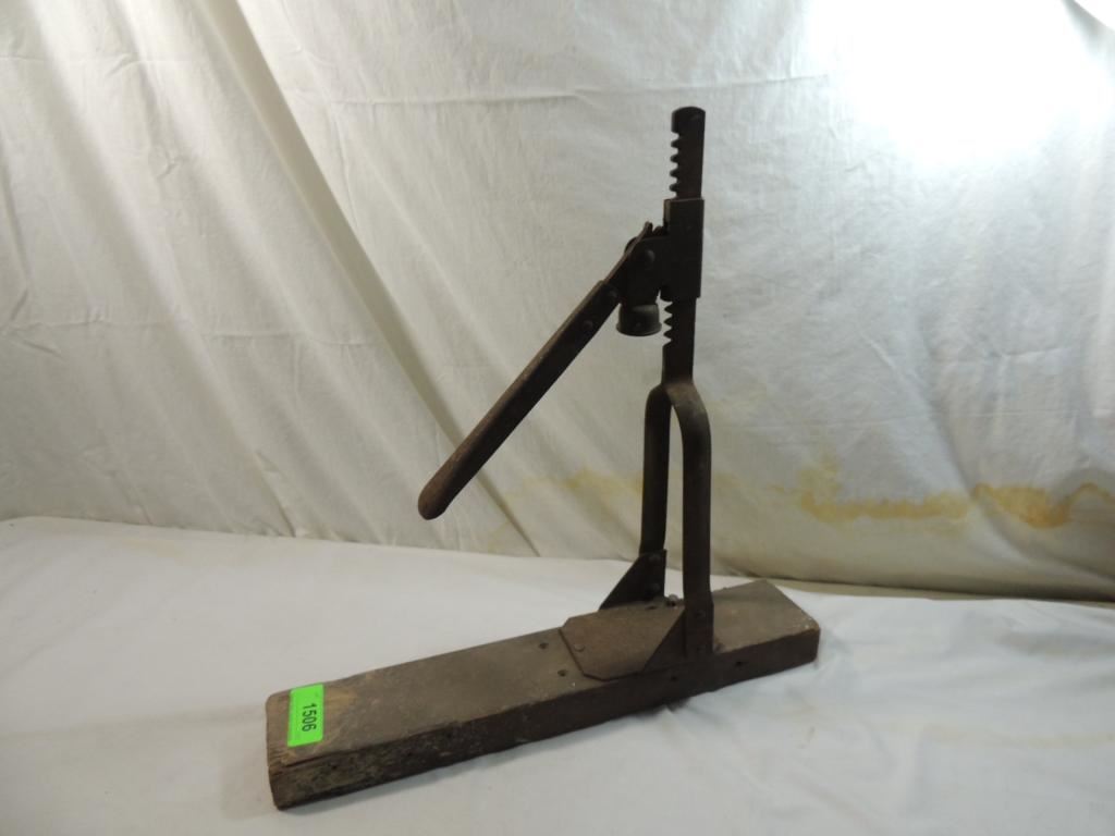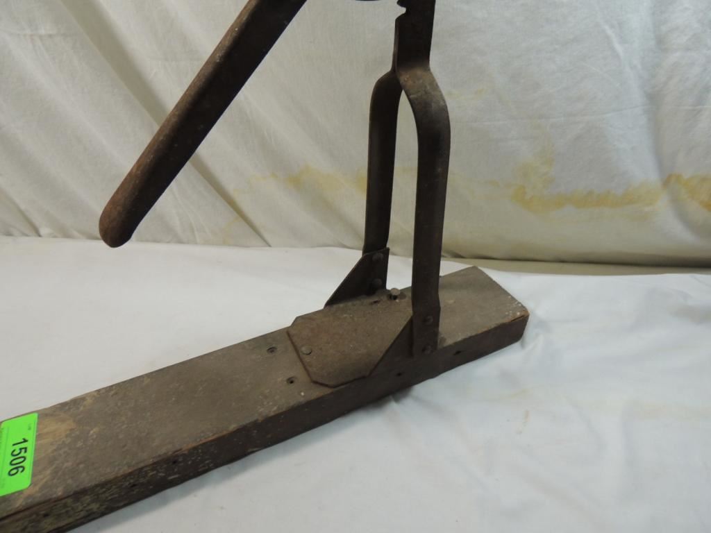 BOTTLE CAPPER MACHINE WOOD BASE IRON ANTIQUE WINE CORKER, CAPPER HAND TOOL VINTAGE PRIMATIVE HOME BOTTLING AS SHOWN SEE PHOTO FOR MORE DETAILS.