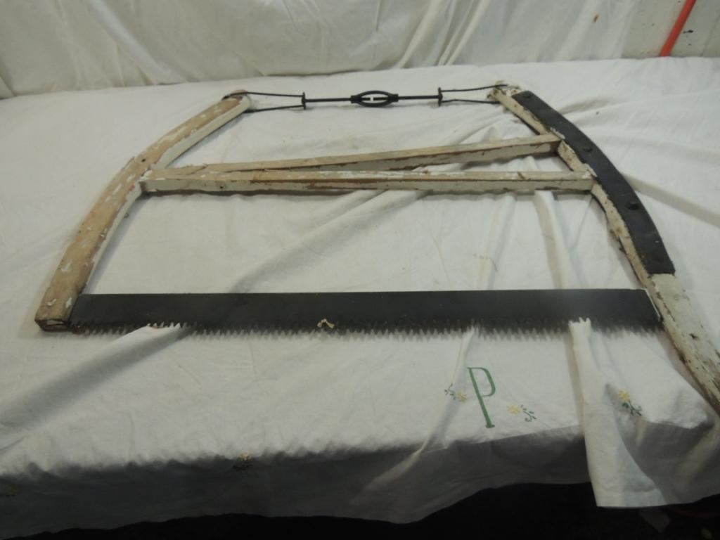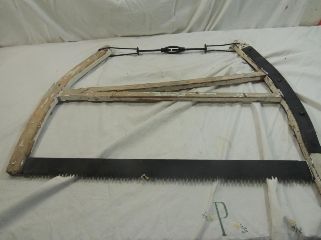 ANTIQUE BOW SAW, WOODEN SAW, DECORATIVE SAW, WALL DECOR, ANTIQUE FARM EQUIPMENT, VINTAGE TOOLS, RUSTIC, AS SHOWN SEE PHOTO FOR MORE DETAILS.
