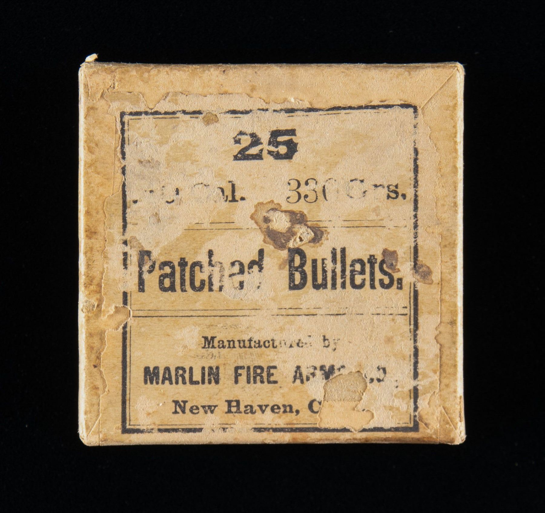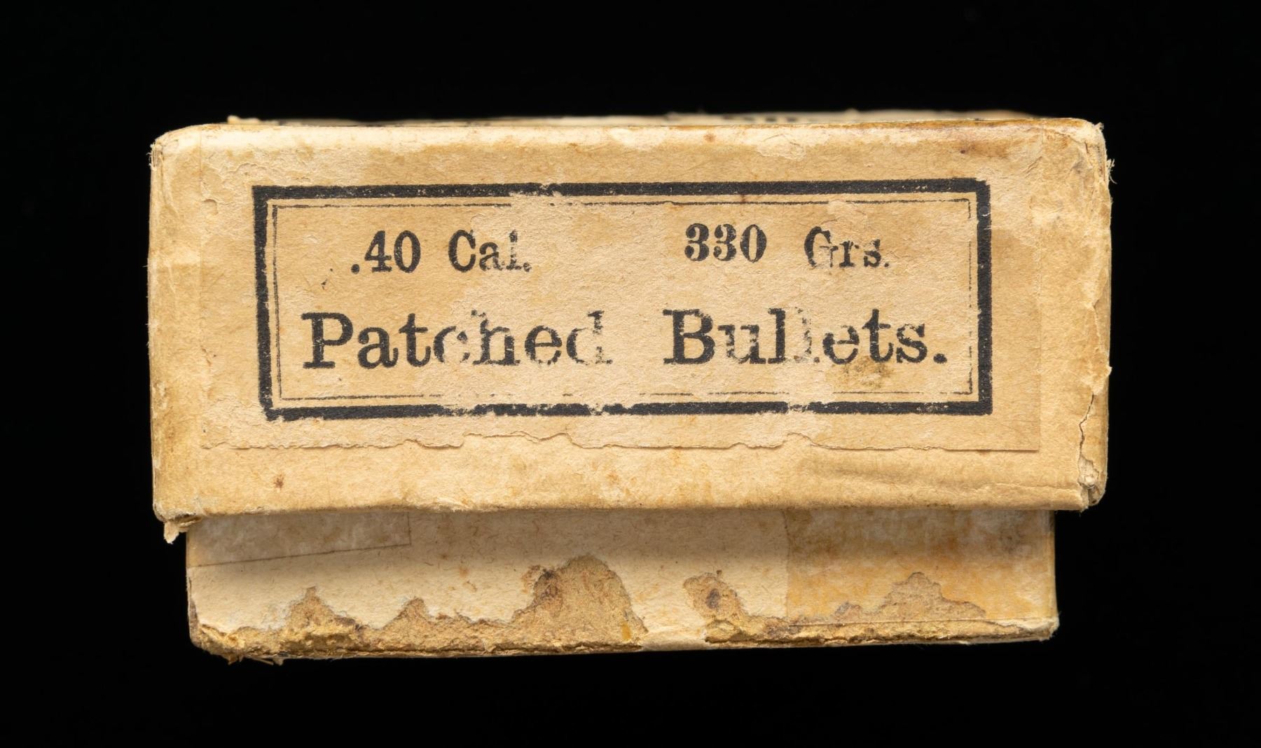 BULLETS. Full brown box of 25 paper patched bullets. CONDITION: box in good overall with lower box having clear tape reinforcement to corners & labels being torn & partially discernable. (02-25094/MD). $300-500.