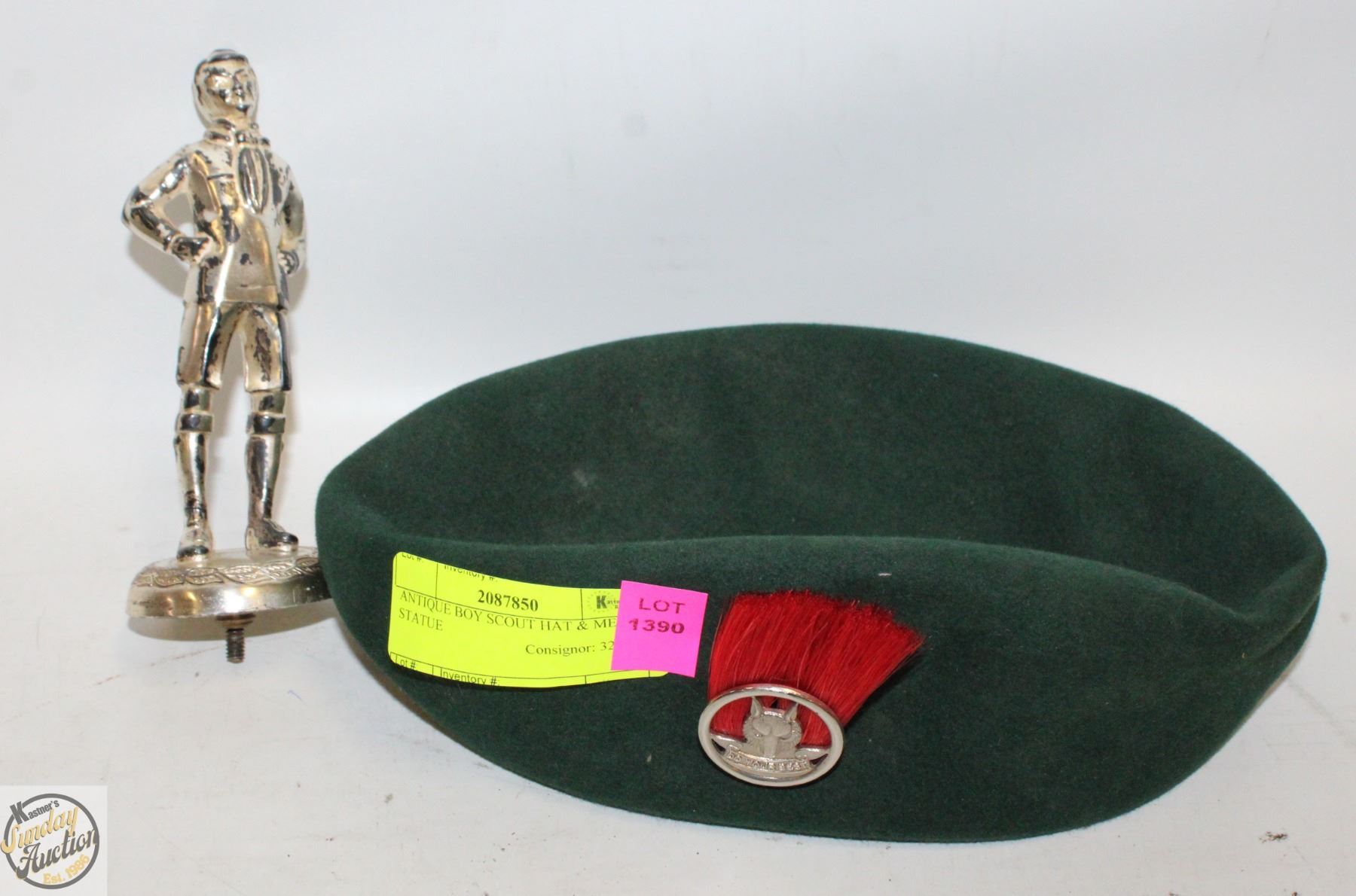 ANTIQUE BOY SCOUT HAT & METAL STATUE