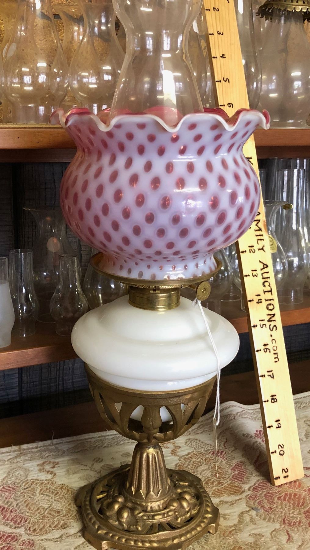ANTIQUE BRASS AND GLASS OIL LAMP
