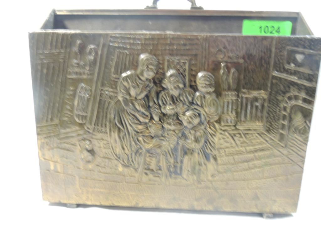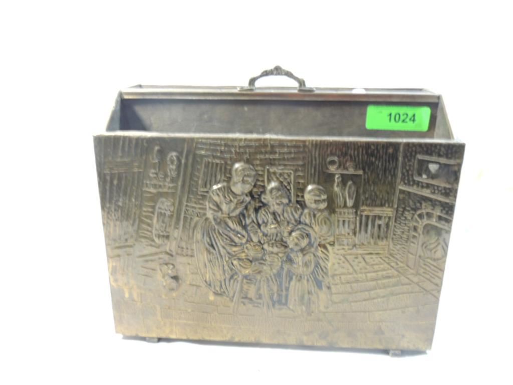 ANTIQUE HANDMADE HAMMERED FIGURAL BRASS WOOD MAGAZINE BOOK STAND RACK HOLDER AS SHOWN. SEE PHOTO FOR MORE DETAILS.