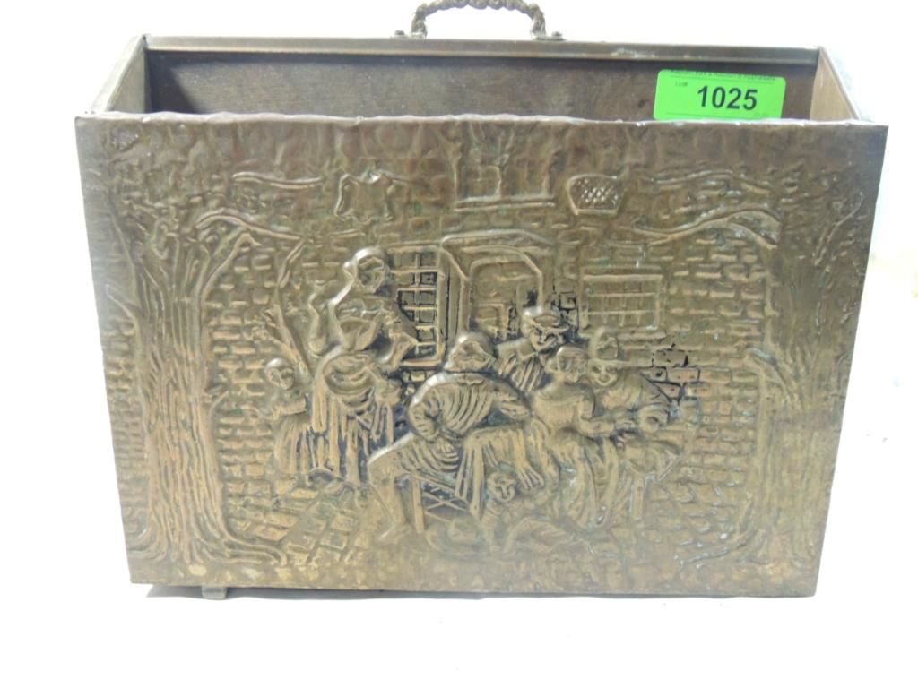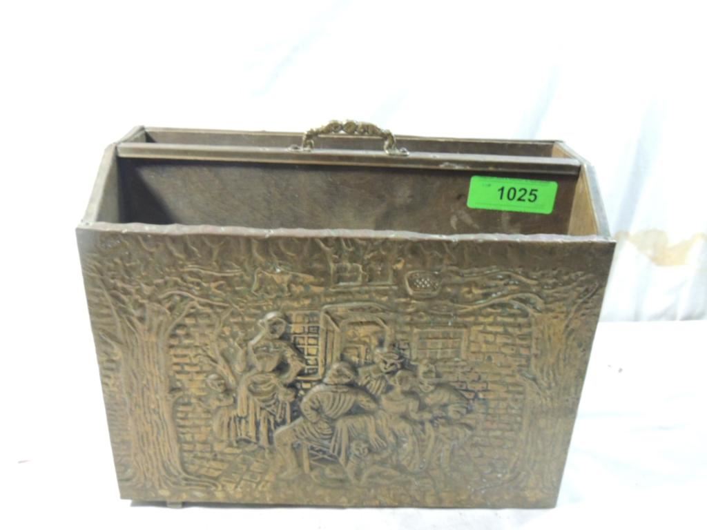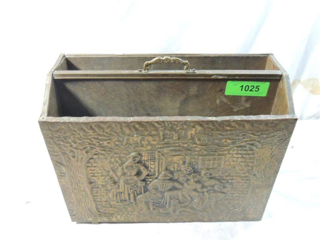 ANTIQUE HANDMADE HAMMERED FIGURAL BRASS WOOD MAGAZINE BOOK STAND RACK HOLDER AS SHOWN. SEE PHOTO FOR MORE DETAILS.
