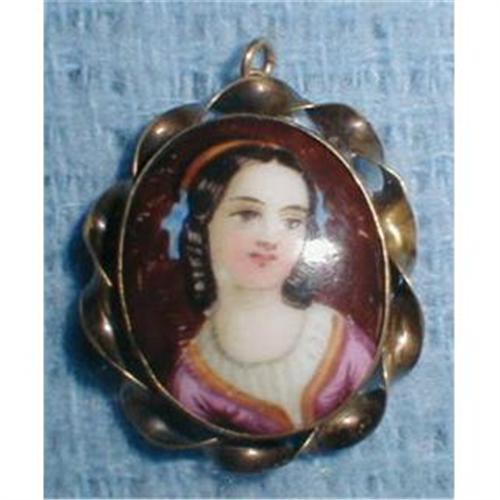 This is a beautiful piece of early Victorian jewelry....a painting on porcelain of a pretty young woman that is very well done...she has a mid 1800's hair-do with colorful ribbons in her hair and nicely detailed clothing. It is 1 1/2" tall and has a twisted gold metal surrounding the frame....it has a loop for a chain and also a pin on the back so that it can be worn in a variety of ways. It is in excellent condition.