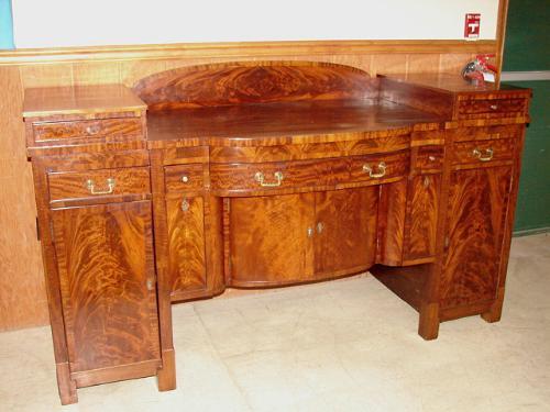 ANTIQUE BURL WALNUT SIDE BOARD. Applely Family sideboard. Made in England around 1840. Designed by John Applely of Spotswood, New Jersey. Made of burl walnut. Nine drawers, two doors and double doors in middle. Excellent overall condition. 46.5”H, 79.5”W, 30”D