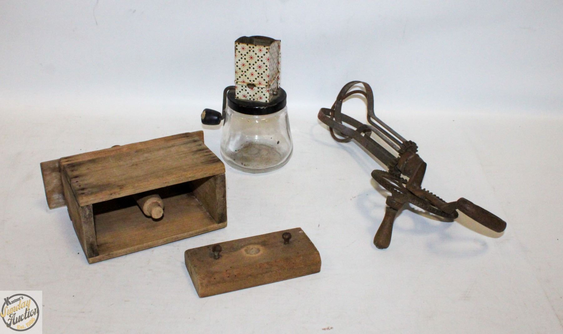 ANTIQUE BUTTER PRESS, EGG BEATER,