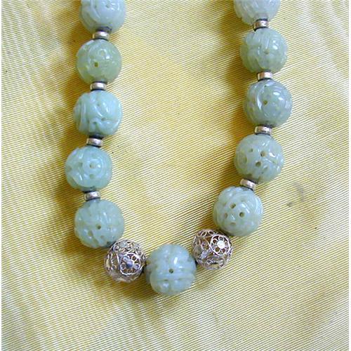 VINTAGE CARVED SERPENTINE JADE BEADS have been restrung and enhanced with a hand-made sterling clasp and sterling rondells and two openwork sterling beads. These beautiful beads are pale celadon in color & totally chic. <> BURTON BROOK FARM ANTIQUES
